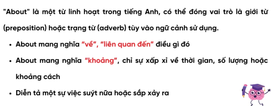"About" là một từ linh hoạt trong tiếng Anh, có thể đóng vai trò là giới từ (preposition) hoặc trạng từ (adverb) tùy vào ngữ cảnh sử dụng. Dưới đây là một số ý nghĩa phổ biến của "about":