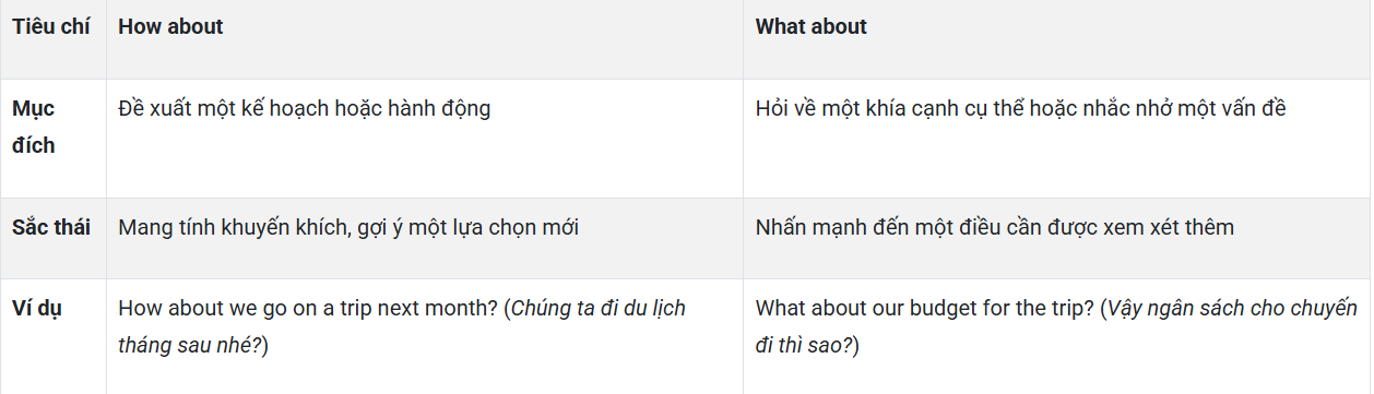 Như vậy, mặc dù cả hai đều có thể dùng để đưa ra gợi ý, "How about" thiên về đề xuất một ý tưởng mới, còn "What about" thường để nhắc nhở về một điều có liên quan hoặc yêu cầu cân nhắc thêm.