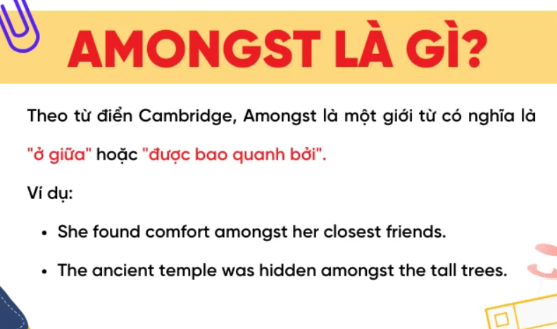 Theo từ điển Cambridge, amongst là một giới từ có nghĩa là "ở giữa" hoặc "được bao quanh bởi". Về ý nghĩa, amongst tương tự among và có thể thay thế cho nhau trong nhiều trường hợp. Tuy nhiên, amongst thường được dùng trong văn phong trang trọng hoặc Anh Anh nhiều hơn so với Anh Mỹ.