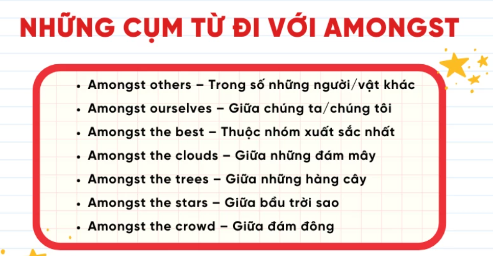 Dưới đây là một số cụm từ phổ biến đi kèm với amongst, giúp bạn mở rộng vốn từ và sử dụng linh hoạt hơn trong tiếng Anh.