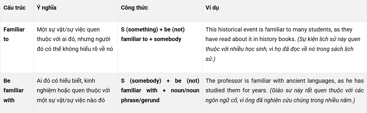 Trong tiếng Anh, familiar thường kết hợp với hai giới từ chính là "to" và "with", dưới đây là các cấu trúc cụ thể: